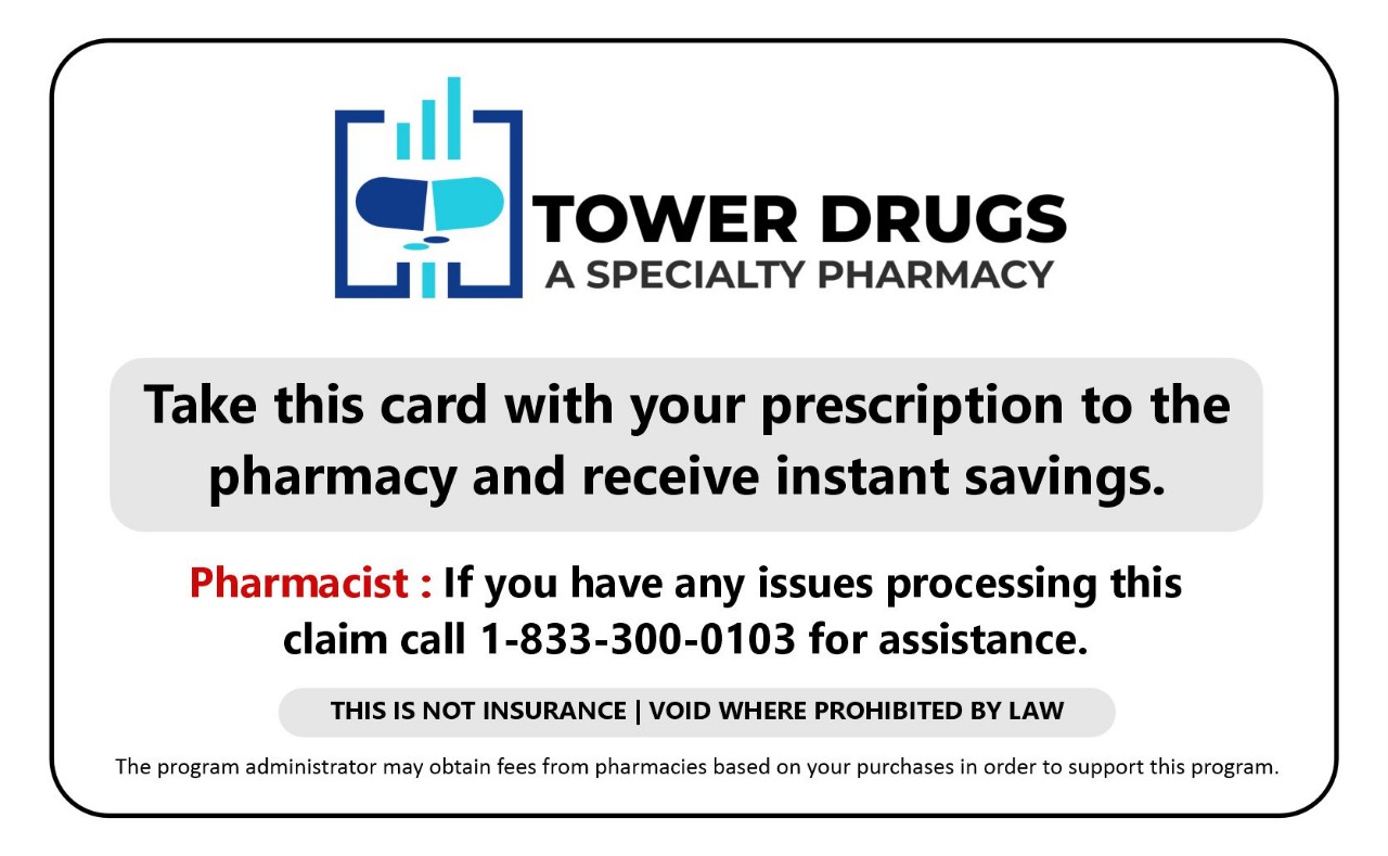 The Tower Drugs Pharmacy medication savings program provides discounts of up to 87% off retail prices at all major chains and most independent pharmacies nationwide.